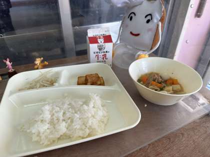 今日の給食は、八宝菜、あつあげのピリ辛じょうゆかけ、もやしの中華あえです。
