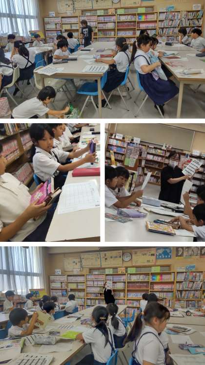 学校司書の川田さんから図書の分類番号について教えてもらいました。本の背表紙の番号や一番最後のページに番号があるのを見つけて、自分が借りた本は何番か記録しました。これからは番号も意識して読みたい本が探せるようになるといいなと思います。