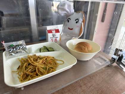 今日の給食は、カレースパゲッティ、きゅうりのピクルス、ミニフィッシュです。