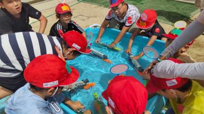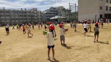 保護者の方の発案で校庭で思いっきり相手チームのポイを狙って水鉄砲でゲームを楽しみました。お手伝いいただいたPTAの皆さんありがとうございました。