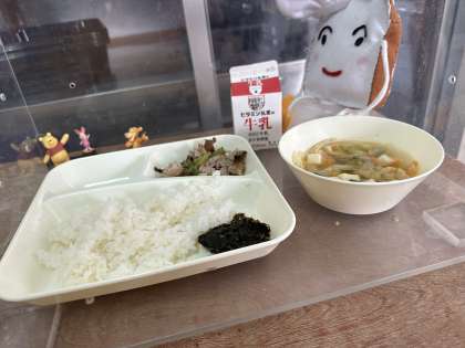 今日の給食は、豚肉の梅風味焼き、五目汁、のりのつくだ煮です。