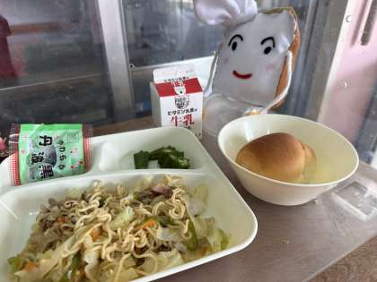 今日の給食は、和風焼きそば、オクラの甘酢あえ、ソフト黒豆です。