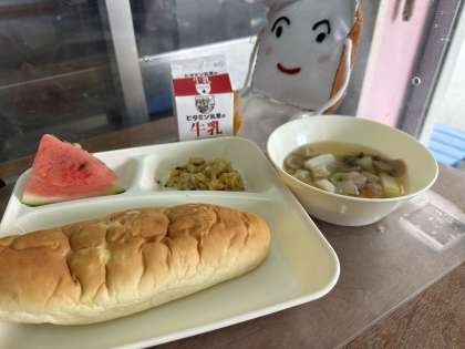今日の給食は、チキンパエリア、ウインナーとキャベツのスープ、すいかです。