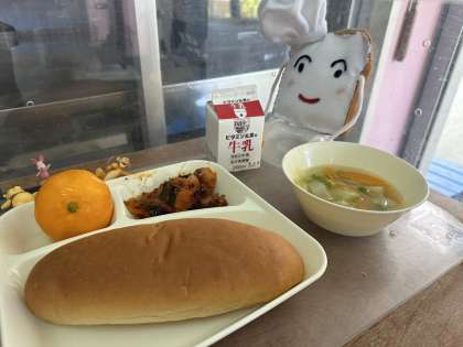 今日の給食は、かぼちゃのミートグラタン、鶏肉と野菜のスープ、みかん(れいとう)です。