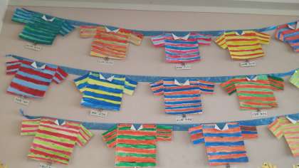 絵の具でボーダーのTシャツを描きました。それぞれ思い思いの色で素敵なTシャツができました。