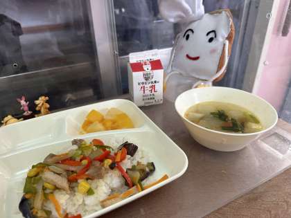 今日の給食は、夏野菜飯、パワースープ、トロピカルゼリーです。