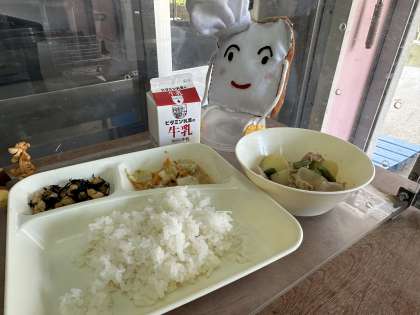 今日の給食は、豚肉とじゃがいもの煮もの、ひじき豆、ささと野菜のごまみそ焼きです。