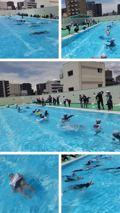 5年生は、服を着てクロールと平泳ぎのどちらが泳ぎやすいかやってみました。平泳ぎの方が泳ぎやすいことがわかりました。5年生はペットボトルだけでなくスーパーの袋でも浮きになることを知りました。また、エレメンタリーバックストローク(イカ泳ぎ)を学びました。体力を使わない泳ぎ方なので知っておくともしものときに使えます。これからの季節、川遊びなどは気をつけて子どもたちだけで遊ばないようにしましょう。