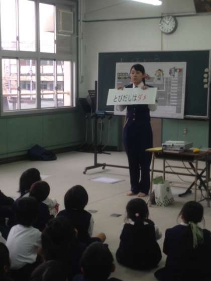 都島警察の方に来ていただき、交通安全指導をしていただきました。本来は、運動場で自転車の乗り方などを学習する予定だったのですが、あいにくの天候のため、今日は、室内で、自動車から身を守るお話や安全な自転車の乗り方について講義していただきました。