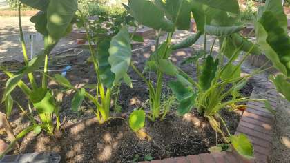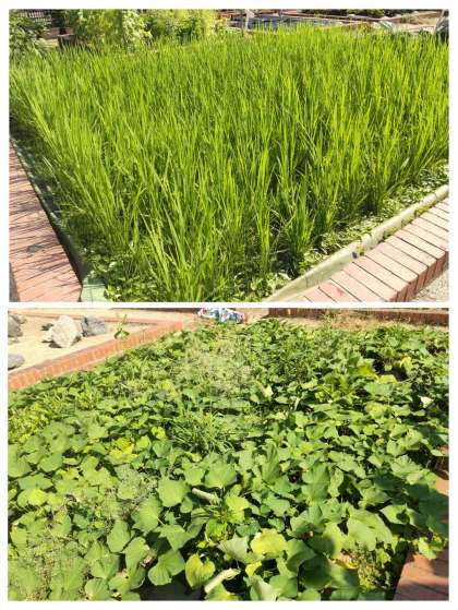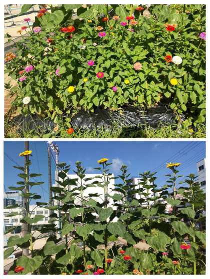 1年生の畑は、マリーゴールドと背が高くなったひまわり、朝なので東を向いてピンと立っています。