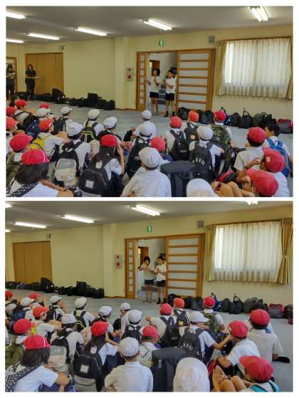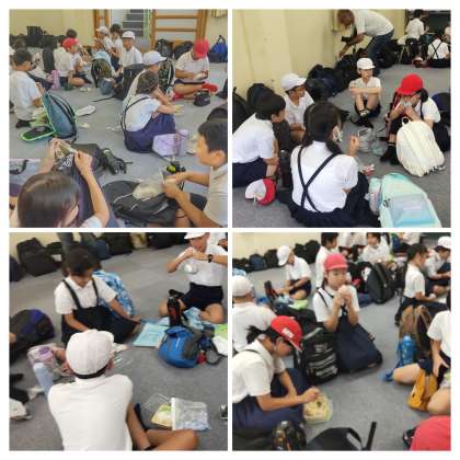 昼食は広場の予定でしたが、暑いので急遽ホールでとることになりました。活動班ごとに円になってお弁当を食べました。笑顔いっぱいです。