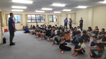 林間学習2日目、あいにくの雨です。朝の集いはホールで行いました。