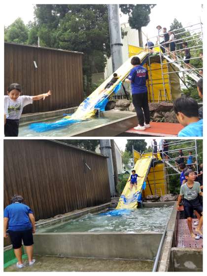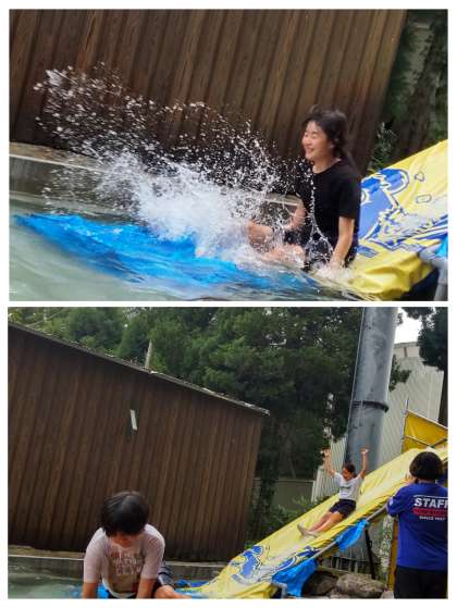 魚が焼けるまで、ウォータースライダーで楽しみました。頭からびしょびしょになってみんな大喜びでした。
