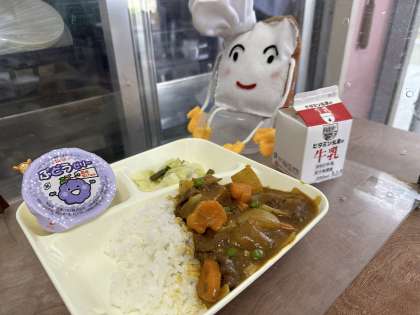 今日の給食は、ビーフカレーライス、野菜のピクルス、ぶどうゼリーです。