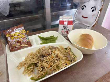 今日の給食は、焼きそば、えだまめ、おさつチップスです。