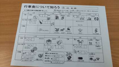 桜宮小学校の栄養教諭の西岡先生に来ていただいて「行事食」について学習しました。12月は、んがつく食べ物を食べると運がつくというゲン担ぎでなんきんやれんこんが出るというお話を聞いているところです。給食では、他の月も行事食があります。どんな行事食があったか聞いてあげてください。