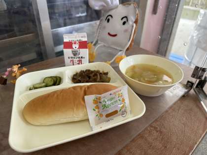 今日の給食は、牛肉のソース煮、スープ、きゅうりのピクルスです。