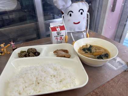 今日の給食は、鶏肉のてり焼き、かぼちゃのみそ汁、なすのそぼろいためです。