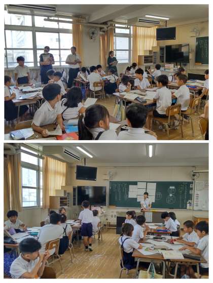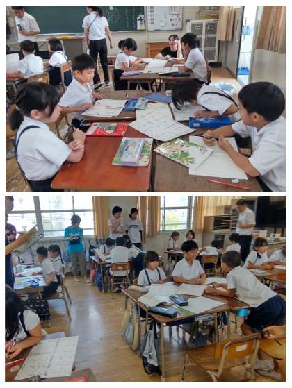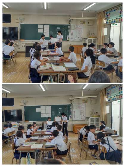 はじめに、昨日しりとりをしたことばを班で話し合って仲間分けしました。どういう仲間分けをしたかみんなに発表しました。最後に好きなもの、苦手なものを仲間分けしたものの中から選んで文を作りました。最後に自分の得意なもので文を作り発表しました。教育実習の先生の得意なものもみんな大きな声で言えて先生も喜んでいましたよ。