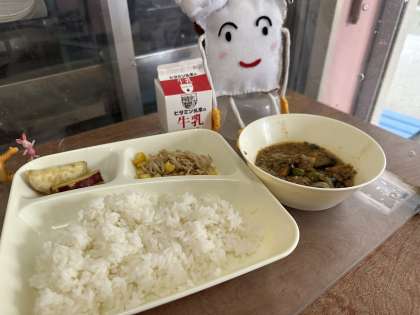 今日の給食は、マーボーなす、ツナと野菜のいためもの、焼きさつまいもの甘みつかけです。