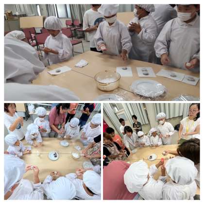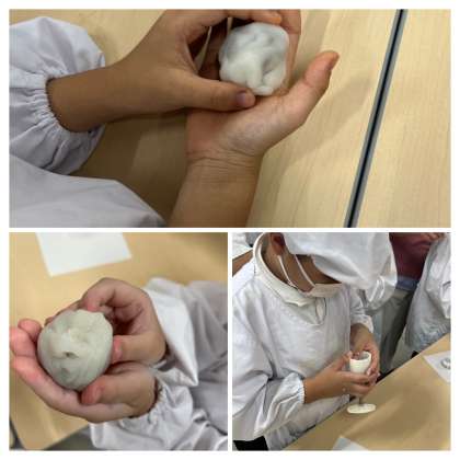今日は中秋の名月に合わせて中国のお菓子月餅を作って食べました。きな粉とこしあんを混ぜたあんこを餅で包んで最後に月餅の型に入れてできあがりです。みんな大喜びでした。