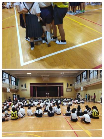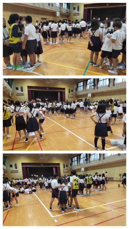 今日は班で新聞紙に乗るゲームでした。集会委員にじゃんけんで負けると、新聞紙を半分、半分と折っていき、乗る面積が小さくなるゲームです。最後までみんな乗れたかな?
