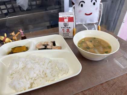 今日の給食は、さけの塩焼き、みそ汁、かぼちゃのいとこ煮です。
