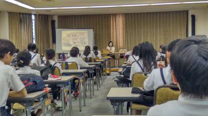 広島工業大学の別館で岩田さんの平和学習の講話を聴きました。いろいろな町の写真を見せていただき、岩田さんのお母さん千鶴子さんのお話を中心に話してくださいました。