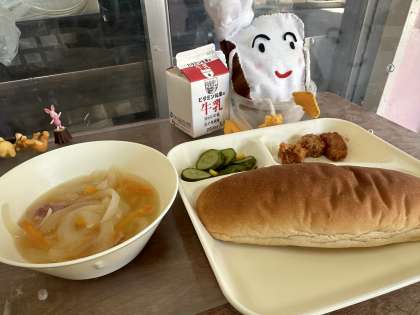今日の給食は、マグロのオーロラ煮、スープ、きゅうりとコーンのサラダです。