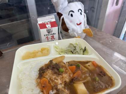 今日の給食は、ハヤシライス、キャベツのひじきドレッシング、白桃(かんづめ)です。