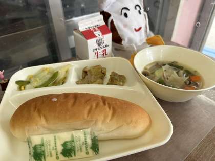 今日の給食は、鶏肉のカレー風味焼き、スープ煮、野菜ソテーです。