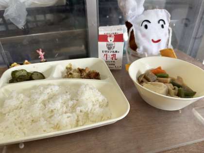 今日の給食は、豚肉のねぎしょうゆ焼き、ふきよせ煮、きゅうりの赤じそあえです。