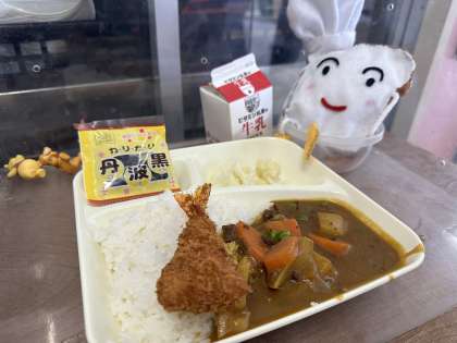 今日の給食は、えびフライカレーライス(えびフライ・カレー)、カリフラワーのピクルス、いり黒豆です。