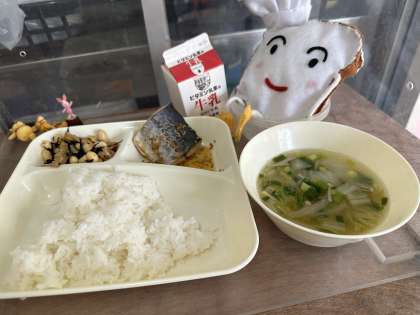 今日の給食は、さごしのごまじょうゆかけ、すまし汁、大豆の煮ものです。
