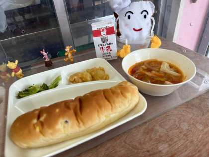 今日の給食は、白身魚のフリッター、ミネストローネ、ブロッコリーのサラダです。