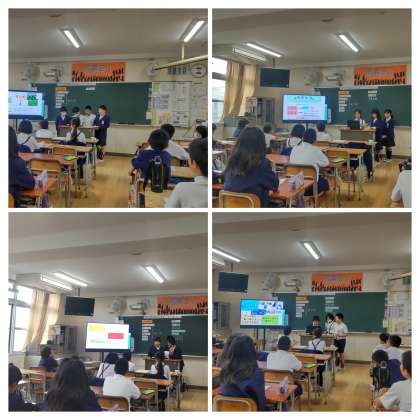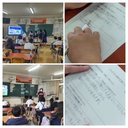 昨日の授業の様子です。日本の食料生産の問題点についてどのように解決していけばよいか各班で調べて考えた案を発表し合いました。調べたことを共有することで似たような意見だと認識したり、違う意見を聞いてなるほどと感心したり交流することができました。そして、自分が消費者の立場として食料生産を上げるためにできることを考えました。