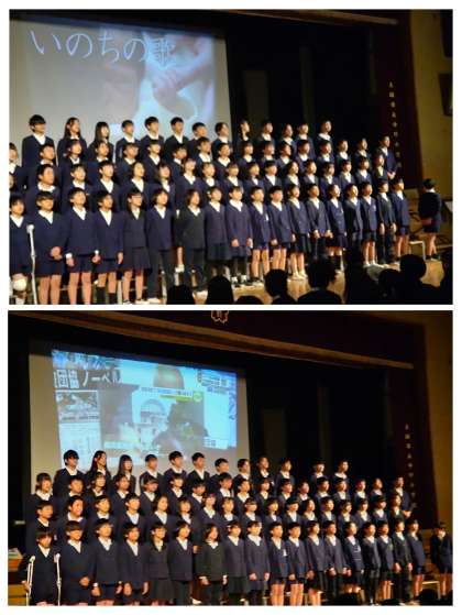 6年生は、平和学習のまとめを発表しました。7月から平和学習を始めて、ピースおおさかで大阪大空襲のことを学習しました。そして、修学旅行のヒロシマへ実際に訪れて見て感じたことを自分の言葉で発表しました。その中で、「明日を信じて」と「いのちのうた」を歌いました。あたりまえの日常があたりまえでなくみんなで守ってきたものであることこれからも守っていくために自分のできることを考えました。