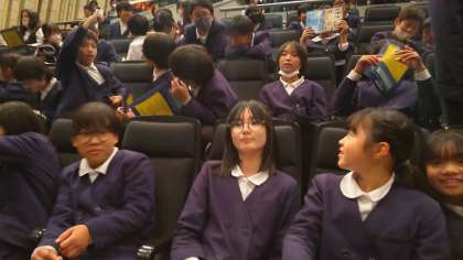6年生は、抽選で当たってオリックス劇場に劇団四季のミュージカル「ガンバの大冒険」を見に行きました。昼からだったので公園でお弁当を食べる予定でしたが、寒かったので、学校で食べてから行きました。始まる前の子どもたちの様子です。