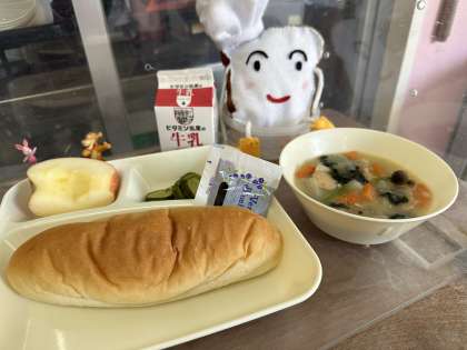 今日の給食は、鶏肉ときのこのシチュー、きゅうりのピクルス、りんごです。