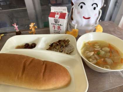 今日の給食は、豚肉のバジル焼き、スープ、うずら豆のグラッセです。