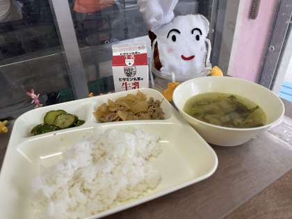 今日の給食は、豚肉とコチジャンいため、鶏肉とはるさめのスープ、きゅうりのナムルです。