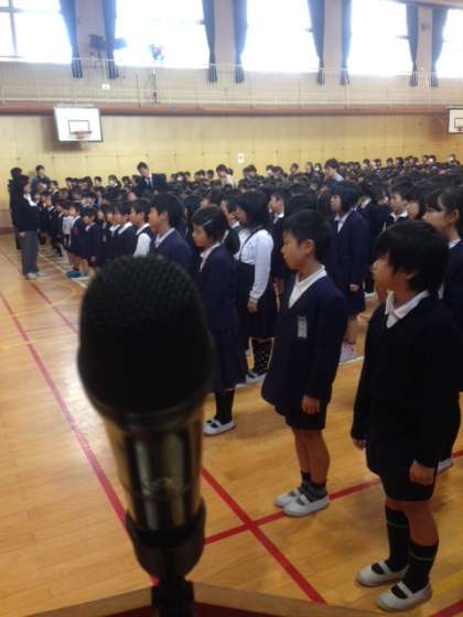 「二学期はたくさんの学校行事がありましたが、みんな本当によく頑張ったと思います。一年生も初めての一学期から二学期になって学校に馴染んでよくがんばりました。運動会は素晴らしい天気の下で最高の演技ができました。作品展も力作ぞろいでこの講堂がいっぱいになりました。みんな、4月からの9か月間でものすごく成長したと思います。今日はこの後で担任の先生から通知表をもらいます。そこには二学期のがんばりが書かれていますのでお家の方と一緒に読んでください。また、5月から始まった二重丸を付けて学校に持ってくる「なかのマスター」、二重丸は増えましたか。これもぜひ併せて、お家の方と話をして今年一年を振り返ってみてください。