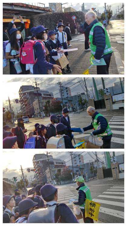 中学校とJRの高架の間の横断歩道に立って子どもたちの安全を守っていてくださっていた吉田さんが、お引越されるということで立ってくださるのは今朝が最後になりました。中野小学校の子どもたちだけでなく、都島中学校の生徒、保育所に向かう親子の方、会社に向かう方等等たくさんの方が吉田さんとの別れを惜しんでおられました。登校班でお世話になった子どもたちの発案で班ごとにお礼のメッセージを冊子にしてお礼の言葉とともに今朝渡しました。吉田さんもとても喜んでくださいました。吉田さんの元気なあいさつ新しい場所でも広げてください。