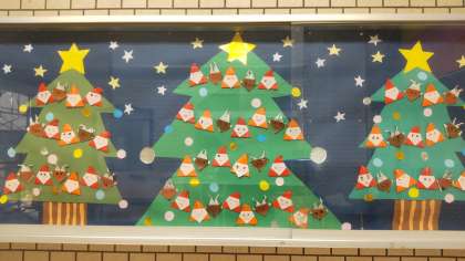 昨日から12月になりました。1年生が作った可愛いサンタが並んでいます。