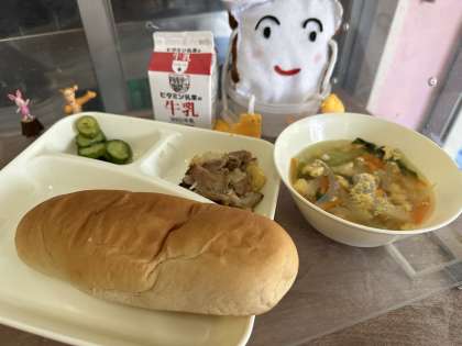 今日の給食は、中華おこわ、卵スープ、きゅうりのピリ辛あえです。