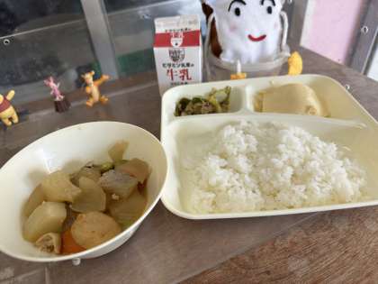 今日の給食は、卵どうふ、一口がんもと野菜の煮もの、キャベツとピーマンのそぼろいためです。