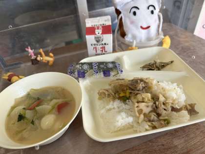 今日の給食は、れんこんのちらしずし(きざみのり)、ぞう煮、ごまめです。