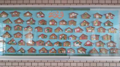 9日から3学期が始まりました。玄関には絵馬が飾ってあります。3年生がタブレットで図案を探して工夫して作りました。どんな願い事をしたのかな?