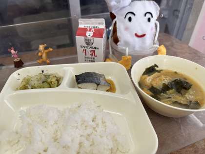 今日の給食は、さごしのしょうゆだれかけ、みそ汁、キャベツの赤じそあえです。