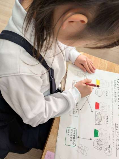 献立のごはん、焼き魚、サラダを赤、青、?の仲間に分けて、はたらきについて学びました。食材の命をもらって「いただきます」食べ物がたくさんの人の手により食卓に上がることに感謝して「ごちそうさま」ということも学びました